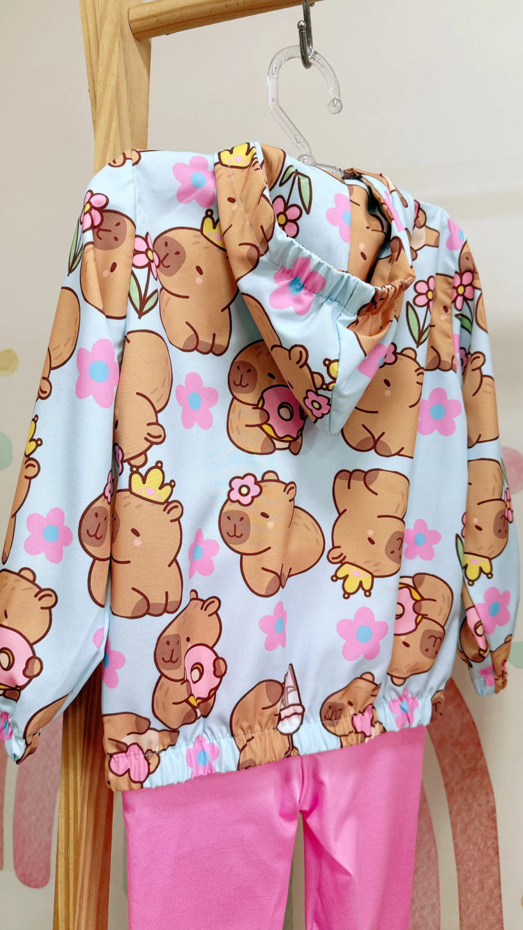 Corta vento com capuz e zíper no tecido crepe santorini e calça legging na malha de algodão na linha premium.