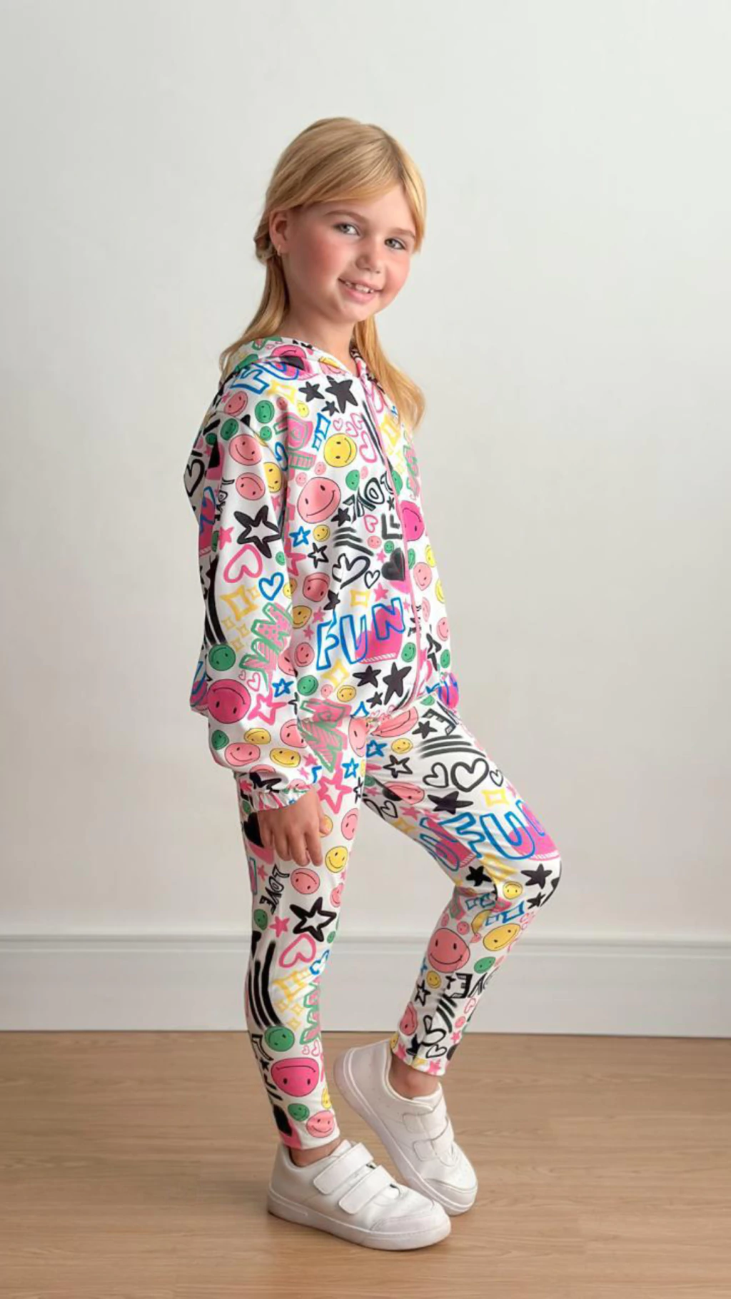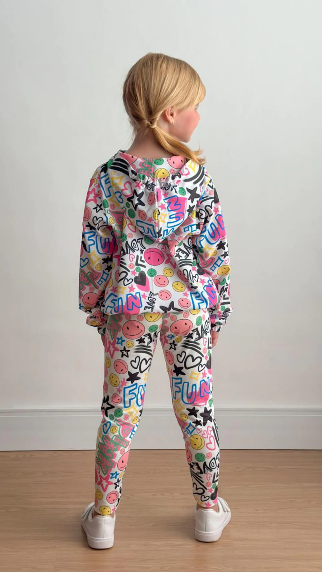 Corta vento com capuz e zíper no tecido crepe santorini e calça legging na malha de algodão na linha premium.