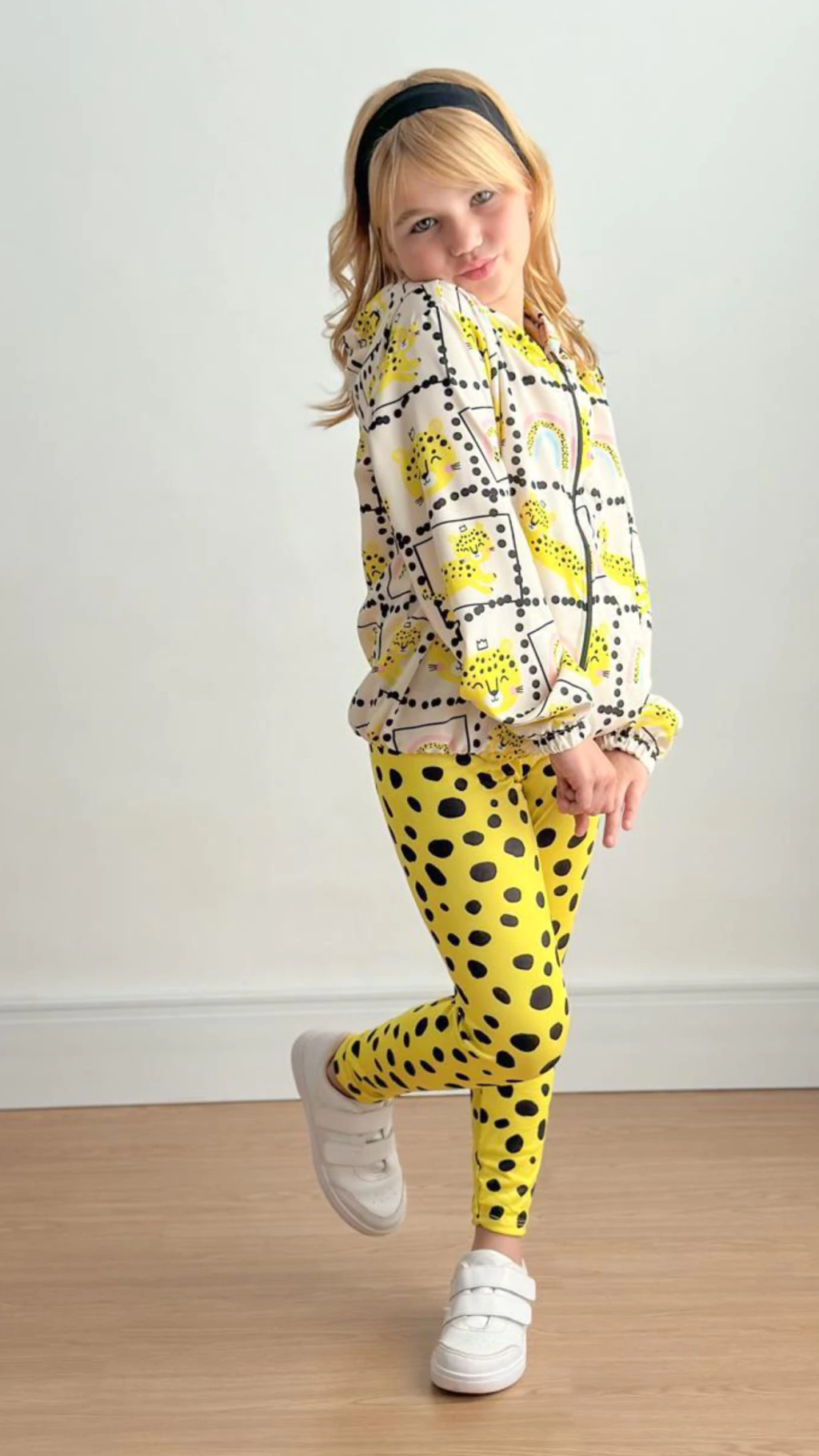 Corta vento com capuz e zíper no tecido crepe santorini e calça legging na malha de algodão na linha premium.