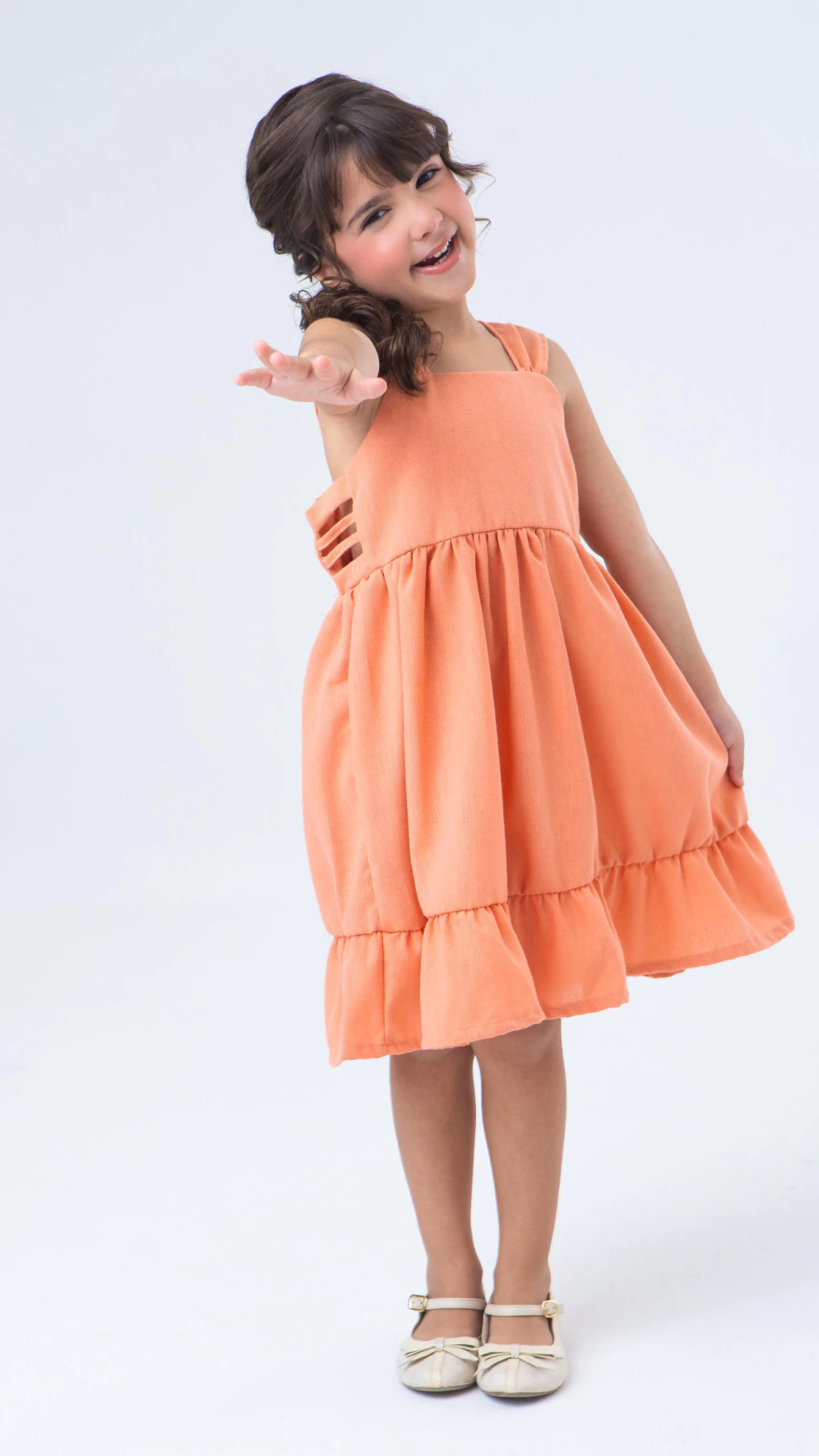 Detalhes: Alças médias, corte reto com leve franzido na cintura e barrado com detalhe de babado. Fechamento nas costas com botões.